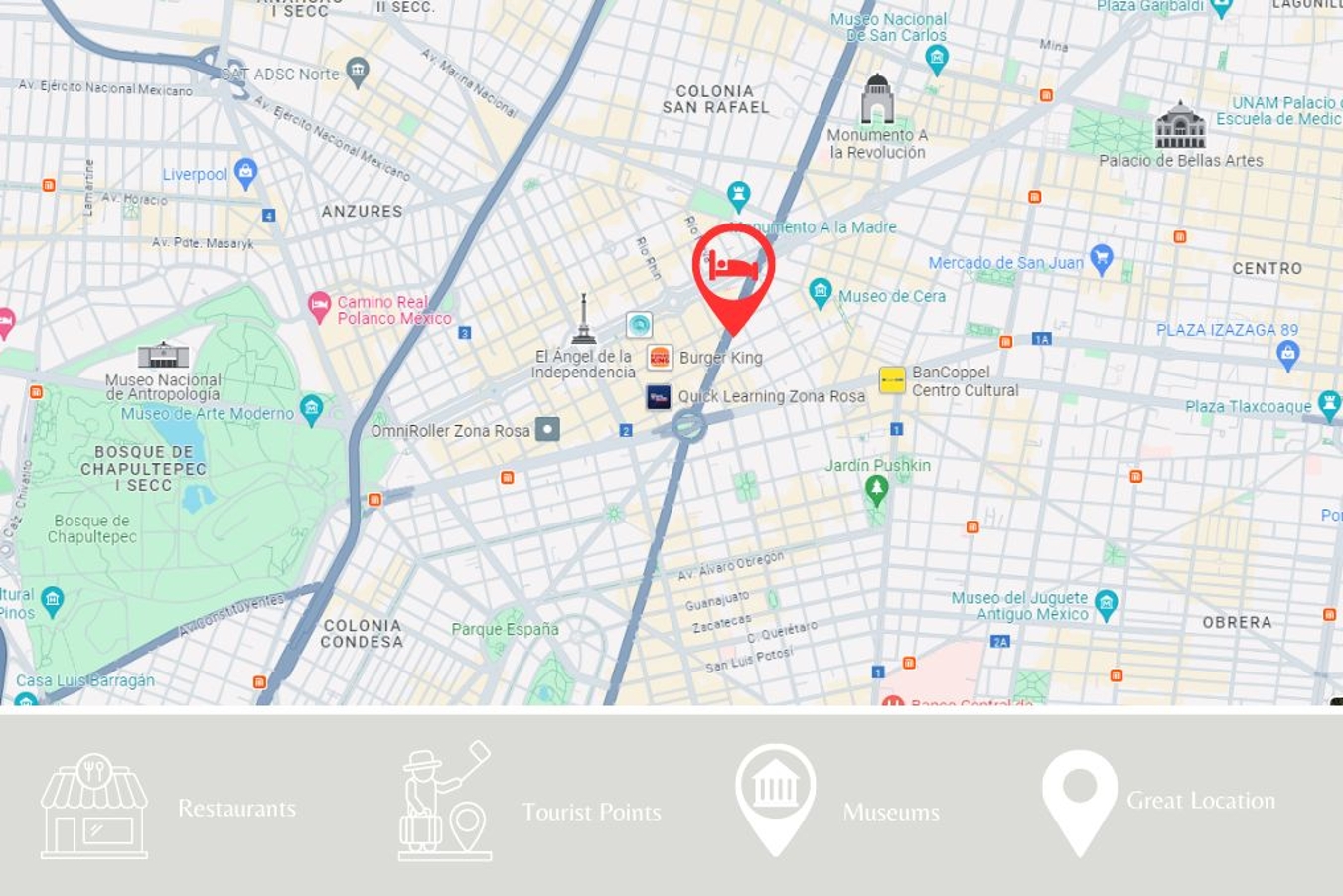 The Mexico City International Airport (MEX) is about 12 km or 7.5 miles away. Note there is more than one international airport; please check your mobile map app for the exact distance. The Metrobus, the city's newest public transportation system, conveniently stops right in front of the building at Hamburo station. Additionally, the "Insurgentes" subway station is only 700 meters away for further accessibility. Let us know if you would like us to arrange an airport transfer (there’s a cost) otherwise, you have the following options: - Taxi: Look for the authorized taxi stands inside the airport terminal. These taxis are safe and regulated. Ensure you agree on the fare with the driver before starting the journey. It's generally a good idea to have some local currency (Mexican Pesos) on hand to pay for the taxi ride. - Private Car Service: Many private car services and rideshare companies operate in Mexico City. You can book a ride in advance using apps like Uber or Didi Chuxing.